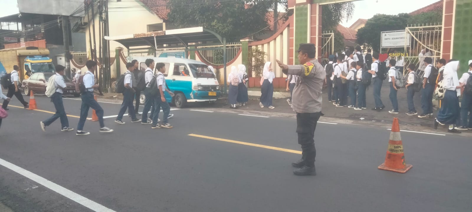 Aipda Karna turun langsung ke titik rawan kemacetan di Depan SMPN 1 Kramatmulya. Rabu (08/04/2026)