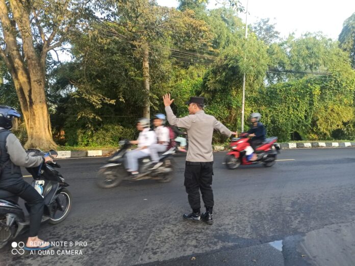 Pengaturan lalu lintas di pagi hari kembali dilaksanakan oleh jajaran Polsek Kramatmulya.