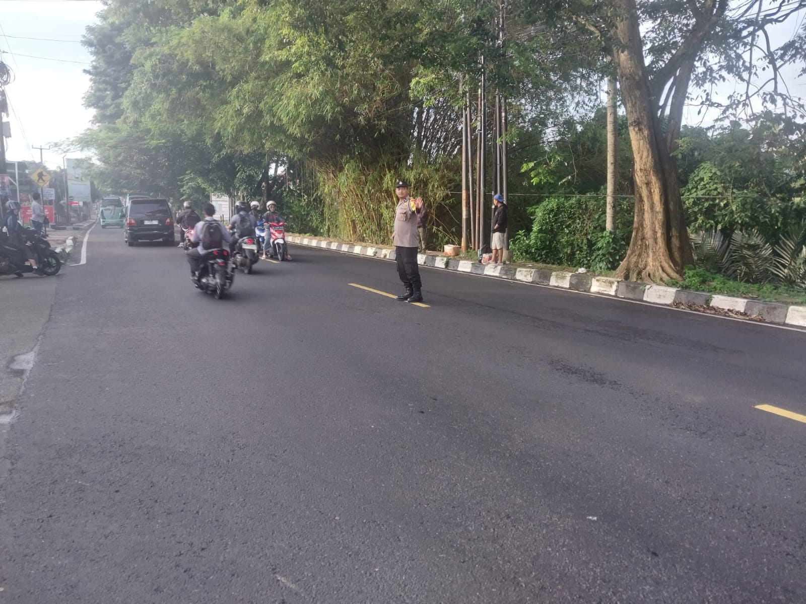 Aipda Rahmat turun langsung ke titik rawan kemacetan di Simpang Tiga Desa Kalapagunung. Senin (02/03/2026)