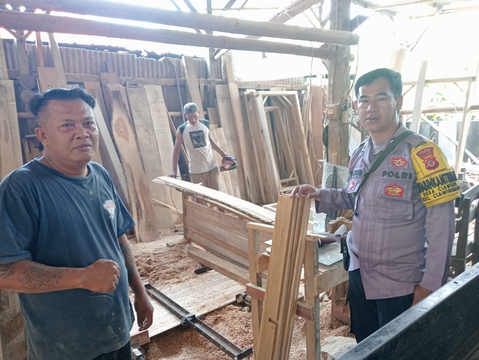 Polres Kuningan Polda Jabar – Bhabinkamtibmas Desa Ciawilor Polsek Ciawigebang Polres Kuningan Polda Jabar, Aiptu Tarjono, melaksanakan kegiatan sambang kamtibmas kepada para pengusaha kusen dan pintu kayu di Desa Ciawilor, Kecamatan Ciawigebang, Kabupaten Kuningan, Minggu (12/4/2026).