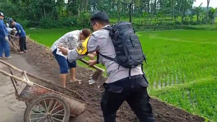 Polres Kuningan Polda Jabar – Bhabinkamtibmas Desa Kadurama Polsek Ciawigebang Polres Kuningan Polda Jawa Barat, Bripka Hendri Priyono, bersama Pemerintahan Desa Kadurama dan warga binaan melaksanakan kegiatan gotong royong membersihkan bahu jalan di Desa Kadurama, Kecamatan Ciawigebang, Kabupaten Kuningan, menjelang pelaksanaan kegiatan perbaikan atau pengaspalan jalan, Rabu (7/1/2026).
