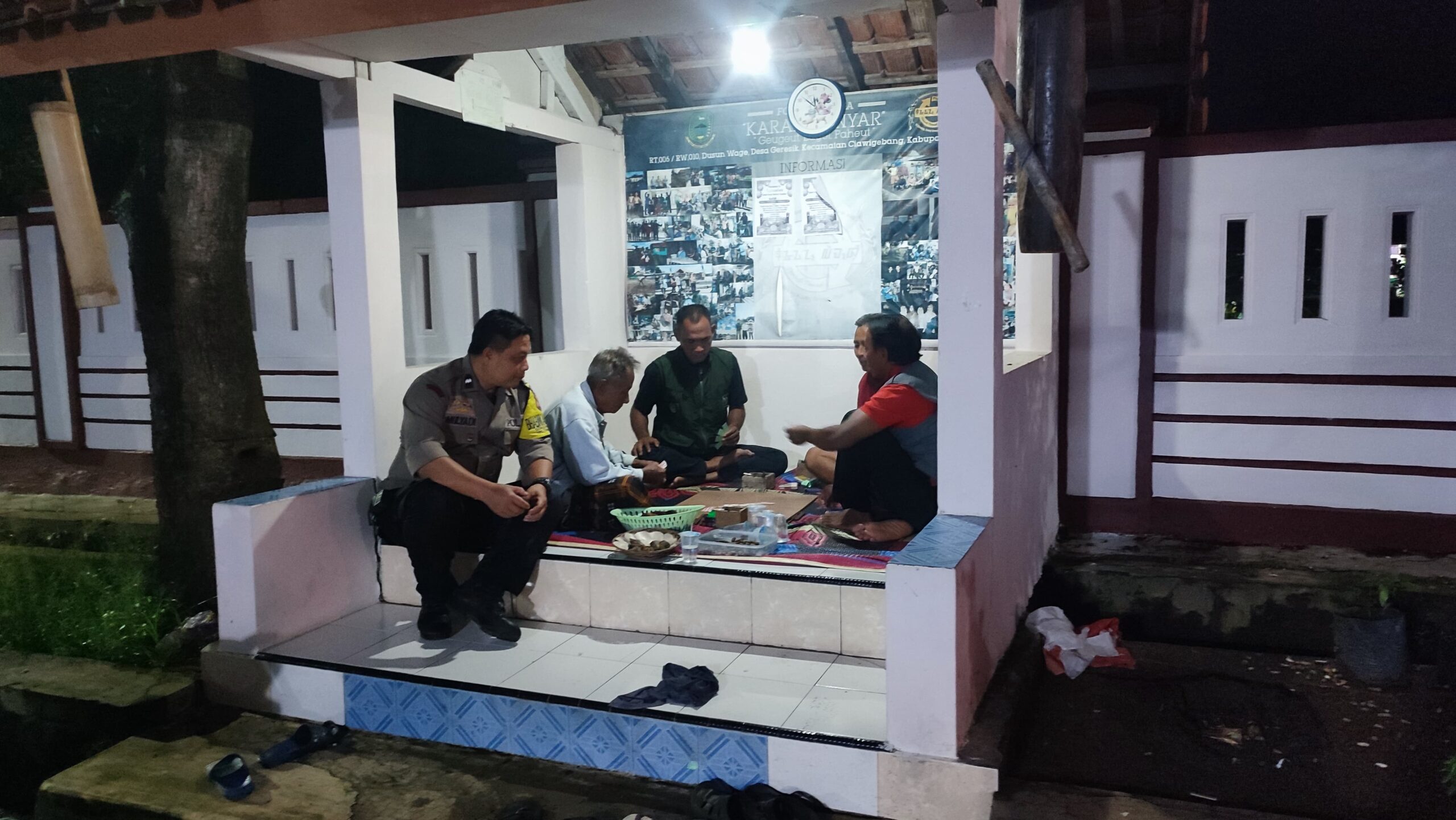 Polres Kuningan Polda Jabar – Anggota Bhabinkamtibmas Polsek Ciawigebang Polres Kuningan Polda Jabar Aipda Mulyadi melaksanakan kegiatan patroli KRYD (Kegiatan Rutin Yang Ditingkatkan) cipta kondisi pada malam hari dengan menyambangi warga yang sedang melaksanakan ronda malam di Pos Ronda Desa Geresik, Kecamatan Ciawigebang, Kabupaten Kuningan, Selasa (10/3/2026).