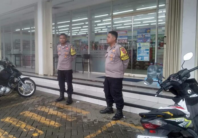 Di pelataran sebuah minimarket, petugas nampak memberikan edukasi kepada warga mengenai pentingnya mewaspadai modus kejahatan hipnotis yang marak terjadi. Interaksi ini membangun ikatan yang kuat antara aparat penegak hukum dengan rakyat yang mereka layani setiap harinya.