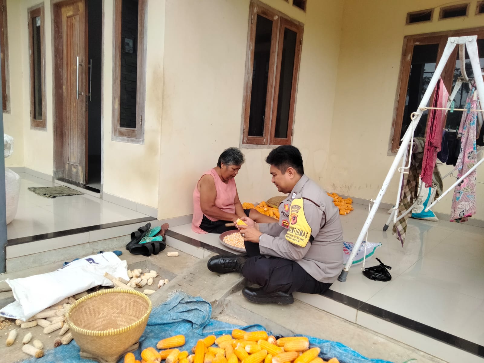 Tanpa ragu, ia duduk bersimpuh membantu Ibu Maryati memipil jagung sambil membuka percakapan mengenai situasi keamanan desa. Momen berharga ini terjadi di tengah suasana pedesaan Randobawagirang pada hari Selasa, 3 Maret 2026.