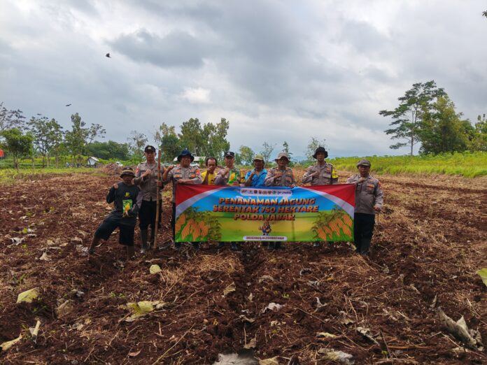 Polres Kuningan Polda Jabar – Kapolsek Ciawigebang Polres Kuningan AKP Dani Supriadi, S.H., beserta anggota Polsek Ciawigebang bersama para petani dan kelompok tani (Poktan) Desa Geresik melaksanakan kegiatan penanaman jagung hibrida serentak kuartal I tahun 2026 di lahan masyarakat binaan Polsek Ciawigebang, Blok Sawah Rangru, Dusun Pon RT 05 RW 08, Desa Geresik, Kecamatan Ciawigebang, Kabupaten Kuningan, dengan luas lahan kurang lebih 1 hektare, Kamis (29/1/2026).