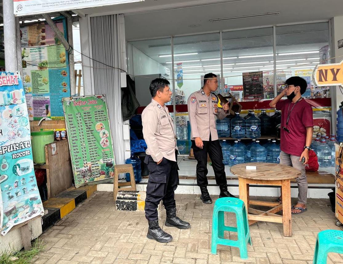 Ka SPKT 2 Aiptu Juro Jauhari, S.H. berdialog dengan pengelola minimarket untuk menyerap informasi mengenai potensi kerawanan keamanan di sekitar toko. Petugas memberikan masukan mengenai pola pengamanan lingkungan dan cara cepat berkoordinasi dengan pihak kepolisian jika terjadi situasi darurat.