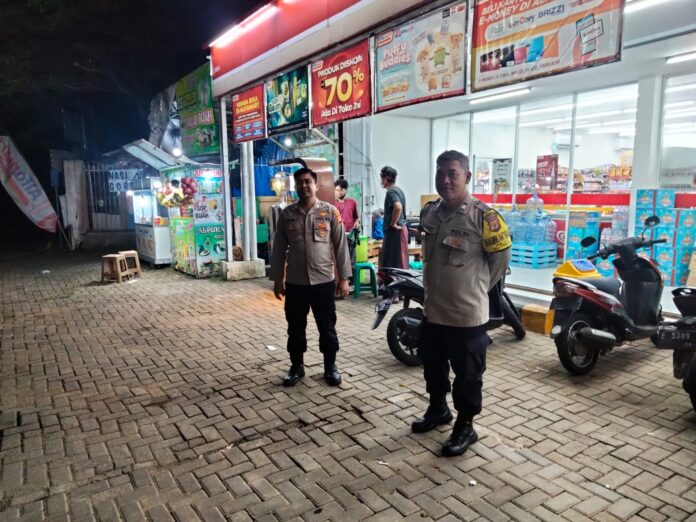 Aiptu Mohamad Sandi Waluyo didampingi Bripka Irfan Takdir menyambangi minimarket di Desa Cirea untuk memastikan protokol keamanan telah dijalankan dengan baik. Mereka mengecek area parkir dan pintu masuk, memastikan tidak ada celah bagi pelaku kejahatan untuk melancarkan aksinya di kegelapan malam.