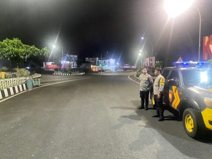 Selain melakukan pemantauan wilayah, petugas juga melaksanakan patroli dialogis dengan masyarakat yang masih beraktivitas pada malam hari.