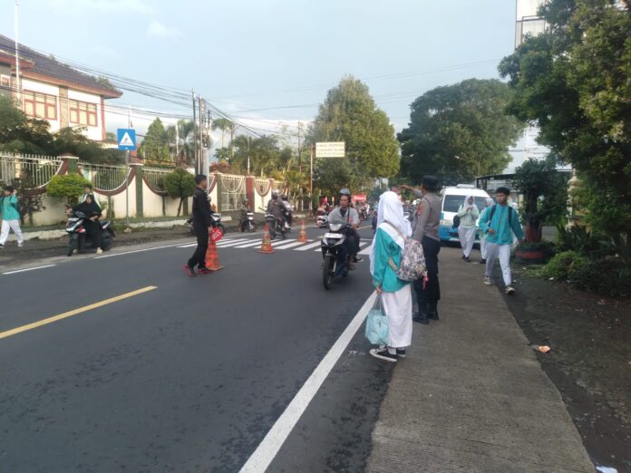 Pengaturan lalu lintas di pagi hari kembali dilaksanakan oleh jajaran Polsek Kramatmulya.