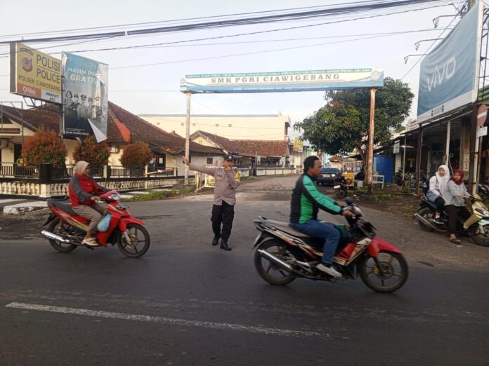 Polres Kuningan Polda Jabar – Anggota Polsek Ciawigebang Polres Kuningan Polda Jawa Barat melaksanakan kegiatan pengamanan dan pengaturan lalu lintas pada pagi hari di Jalan Raya Siliwangi, Kecamatan Ciawigebang, Kabupaten Kuningan, Selasa (13/1/2026).