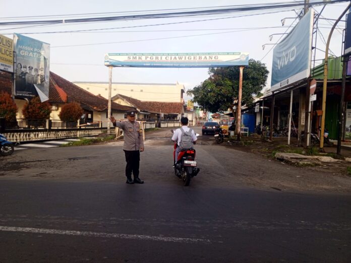 Polsek Ciawigebang Sigap Amankan Arus Lalu Lintas Pagi Hari di Jalan Raya Siliwangi Ciawigebang, Kuningan