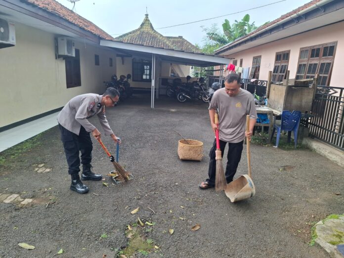 Polres Kuningan Polda Jabar – Anggota Polsek Cidahu melaksanakan kegiatan korve membersihkan halaman Markas Komando (Mako) Polsek Cidahu, pada [27/03/2026]. Kegiatan ini bertujuan untuk menjaga kebersihan dan kerapian lingkungan kantor, serta meningkatkan semangat kerja sama tim.