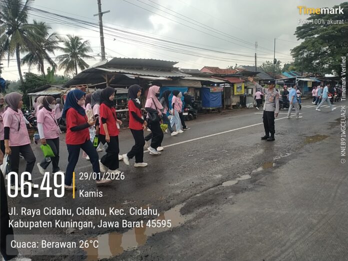 Polres Kuningan Polda Jabar – Anggota Polsek Cidahu, dipimpin oleh Kanit Binmas Aipda Rudianto, melaksanakan pengaturan lalu lintas (PH Pagi) di jalan raya Desa Cieurih, tepatnya depan pabrik Garmen PT. Fashion Stitch Joshua, Kecamatan Cidahu, Kabupaten Kuningan. Kegiatan ini dilakukan untuk mengantisipasi kemacetan dan kecelakaan lalu lintas di area tersebut.