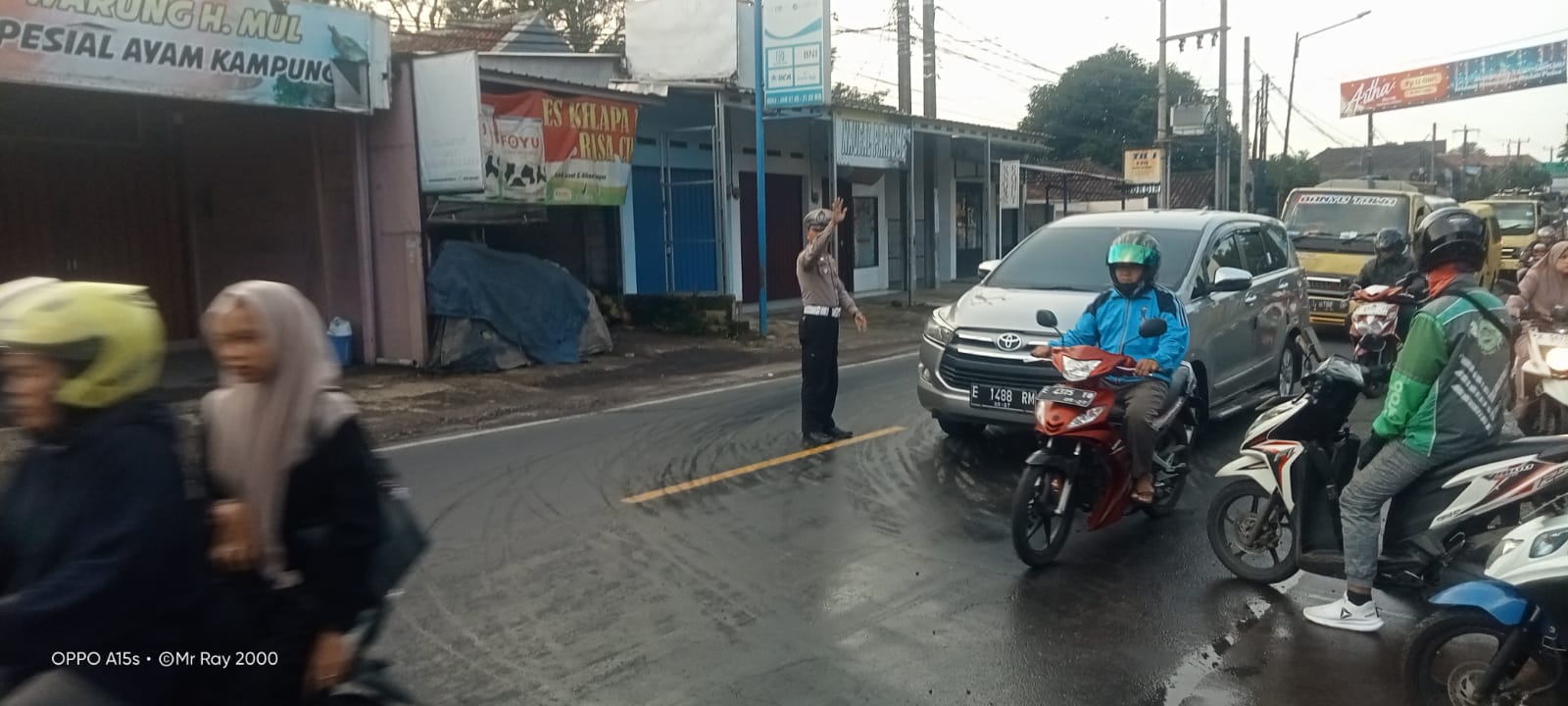 Selain pengaturan arus lalu lintas, petugas turut memberikan imbauan kamtibmas. Pengendara diingatkan agar tetap disiplin dan mematuhi rambu.