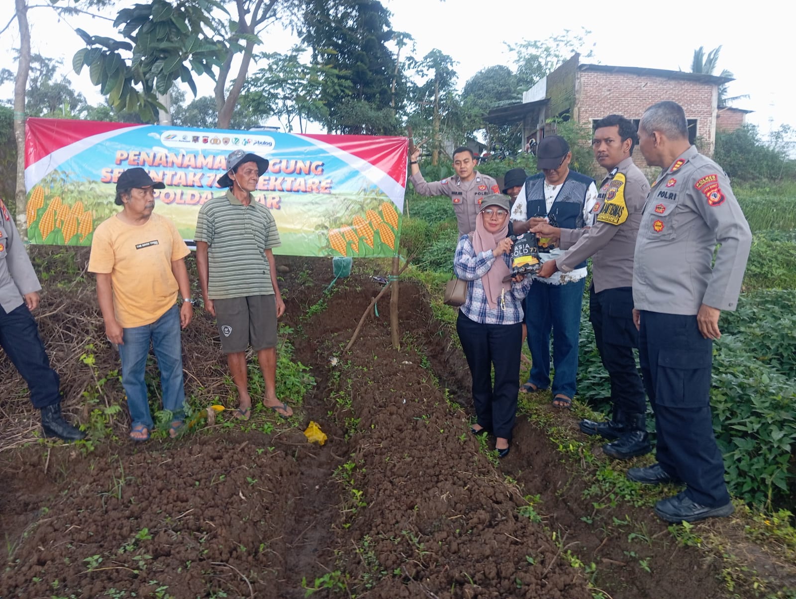 Setelah penyerahan bibit, seluruh peserta bersama-sama melakukan penanaman jagung hibrida di lahan yang telah disiapkan sebelumnya.