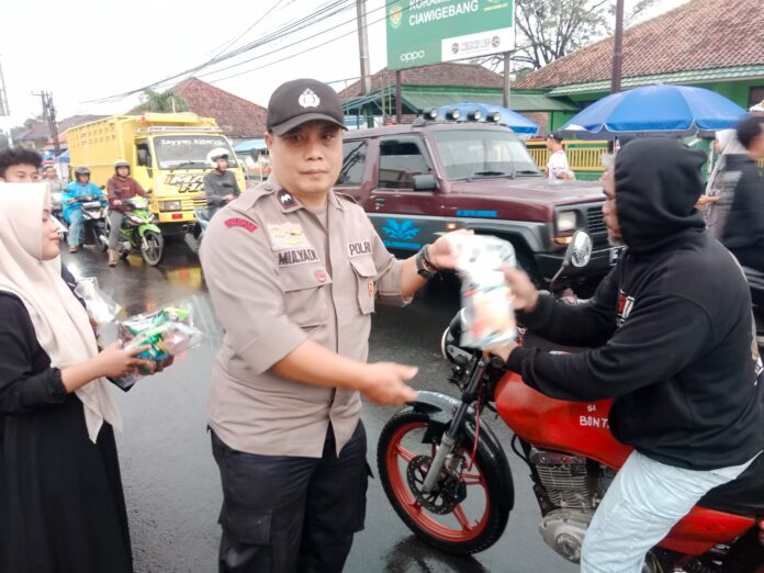 Polres Kuningan Polda Jabar – Polsek Ciawigebang Polres Kuningan Polda Jabar di bawah pimpinan Kapolsek Ciawigebang AKP Dani Supriadi, S.H., bersama SMK PGRI Ciawigebang Kabupaten Kuningan melaksanakan kegiatan sosial berupa pembagian takjil kepada masyarakat pada bulan Ramadhan 1447 H / 2026 M, Senin (16/3/2026).