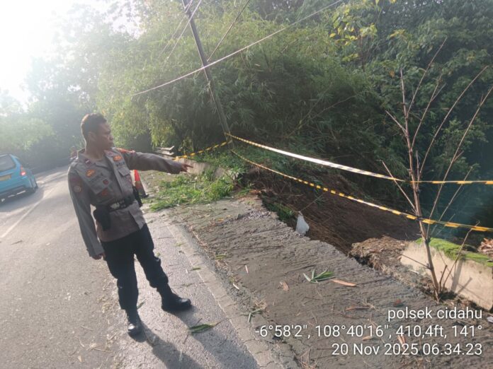 Polres Kuningan Polda Jabar – Anggota Polsek Cidahu, Aiptu Sukriana dan Aipda Tatang H, mendatangi lokasi tanah longsor di pinggir jalan raya tanjakan Desa Legok, Kecamatan Cidahu, Kabupaten Kuningan. Tanah longsor tersebut terjadi akibat intensitas hujan yang sangat deras yang mengguyur wilayah tersebut beberapa hari terakhir.